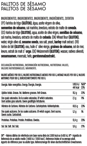 Ingredientes: Farinha de trigo (glúten), água, azeite virgem, sementes de sésamo, sal marinho, levedura, extrato de malte de cevada.